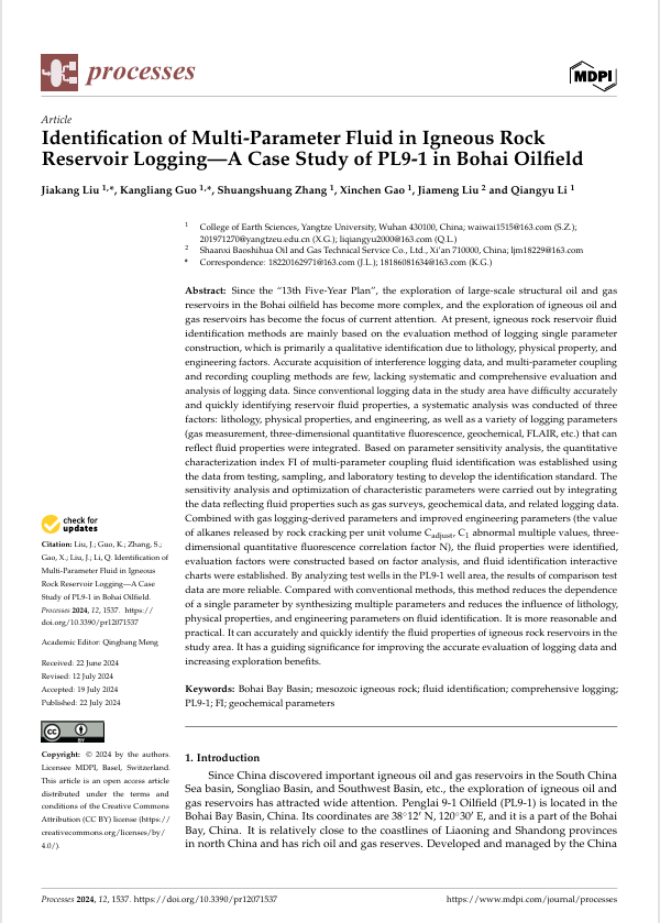 西瓜视频 硕士研究生刘佳康在《Processes》期刊上发表论文 火成岩储层录井中多参数流体的识别——————以渤海油田 PL9-1 为例