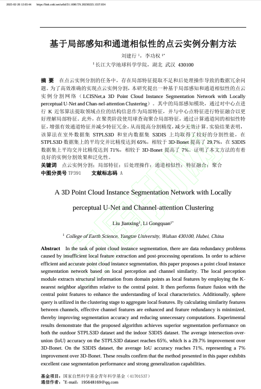 硕士生刘建行在《激光与光电子学进展》发表题为“基于局部感知和通道相似性的点云实例分割方法”的研究论文。西瓜视频