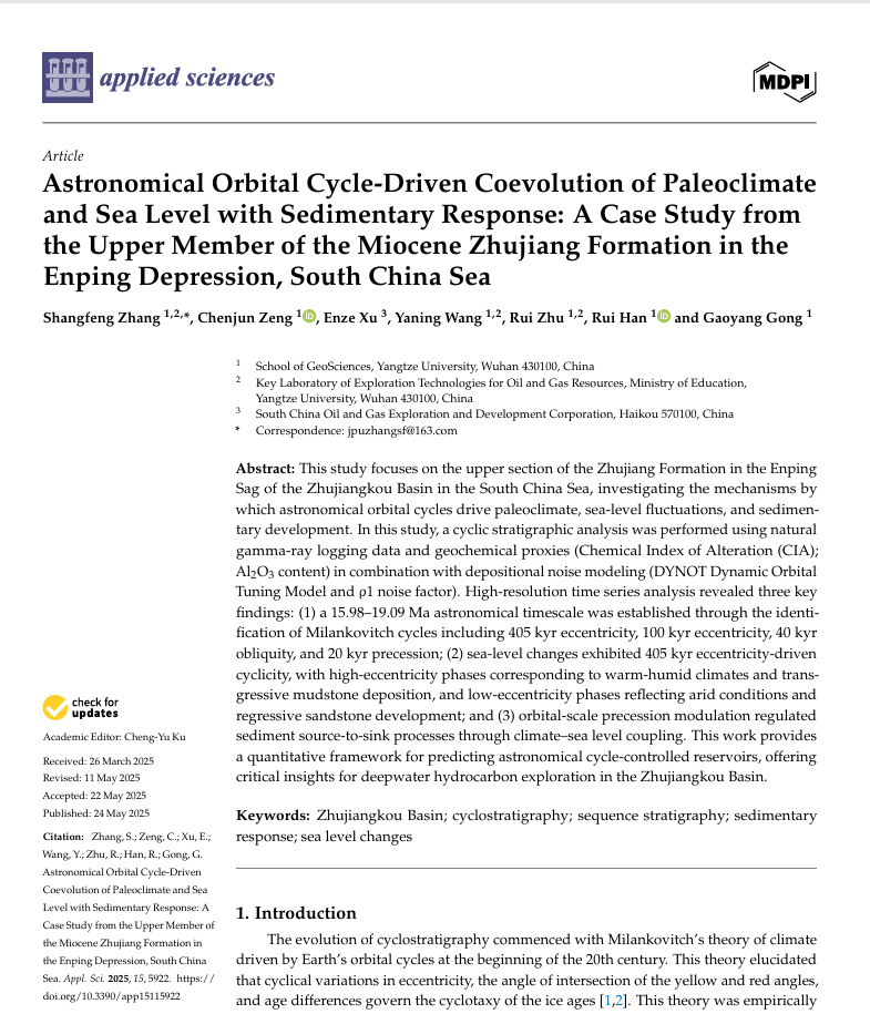张尚锋教授在《Applied sciences》上发表题为“Astronomical Orbital Cycle-Driven Coevolution of Paleoclimate and Sea Level with Sedimentary Response: A Case Study from the Upper Member of the Miocene Zhujiang Formation in the Enping Depression, South China Sea”的研究论文。西瓜视频