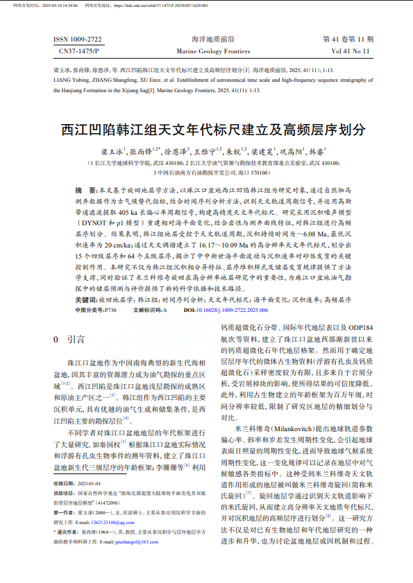 硕士生梁玉冰在《海洋地质前沿》发表题为“西江凹陷韩江组天文年代标尺建立及高频层序划分”的研究论文。西瓜视频
