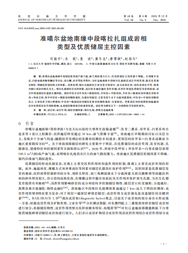 研究生司振宇以第一作者身份在北大核心期刊《东北石油大学学报》上发表题为“准噶尔盆地南缘中段喀拉扎组成岩相类型及优质储层主控因素”的研究论文,西瓜视频