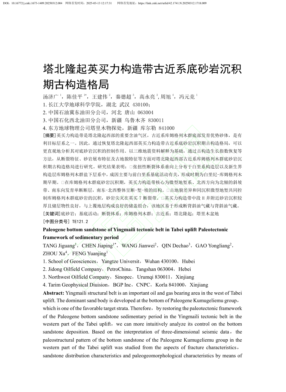 西瓜视频 硕士生陈佳平在西瓜视频 学报(自然科学版)上发表《塔北隆起英买力构造带古近系底砂岩沉积期古构造格局》研究论文
