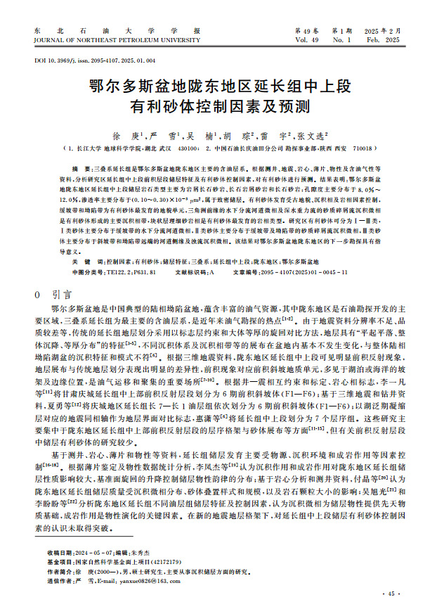 西瓜视频 硕士生徐庚在《东北石油大学学报》上发表题为“鄂尔多斯盆地陇东地区延长组中上段有利砂体控制因素及预测”的研究论文。西瓜视频 为论文第一署名单位,硕士生徐庚为论文第一作者,教师严雪为通讯作者。
