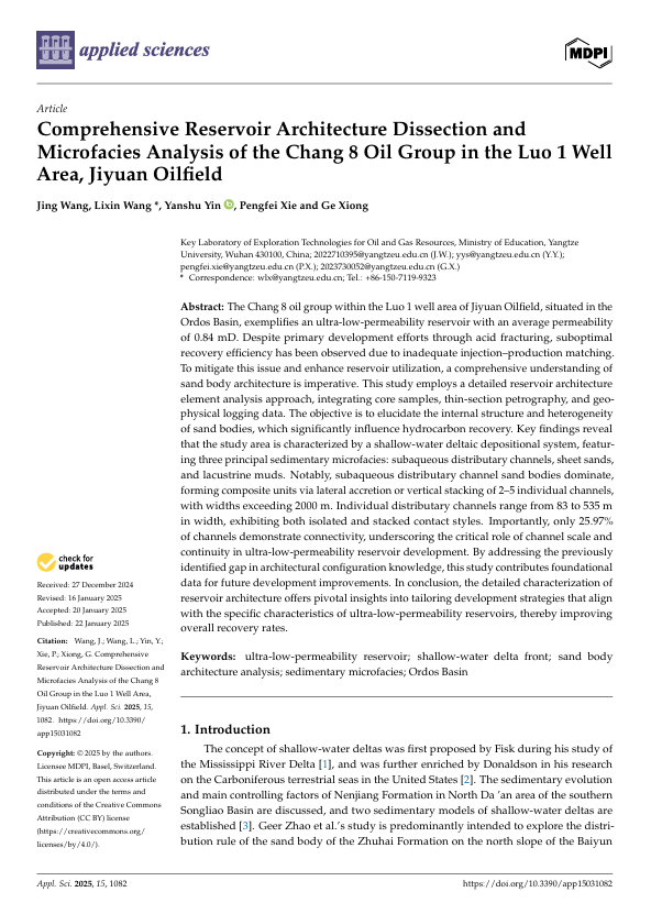 西瓜视频 硕士生王婧在SCI收录期刊《Applied Sciences》上发表题为“Comprehensive Reservoir Architecture Dissection and Microfacies Analysis of the Chang 8 Oil Group in the Luo 1 Well Area, Jiyuan Oilfield”的研究论文。西瓜视频 为论文第一署名单位,王立鑫老师为第一通讯作者。