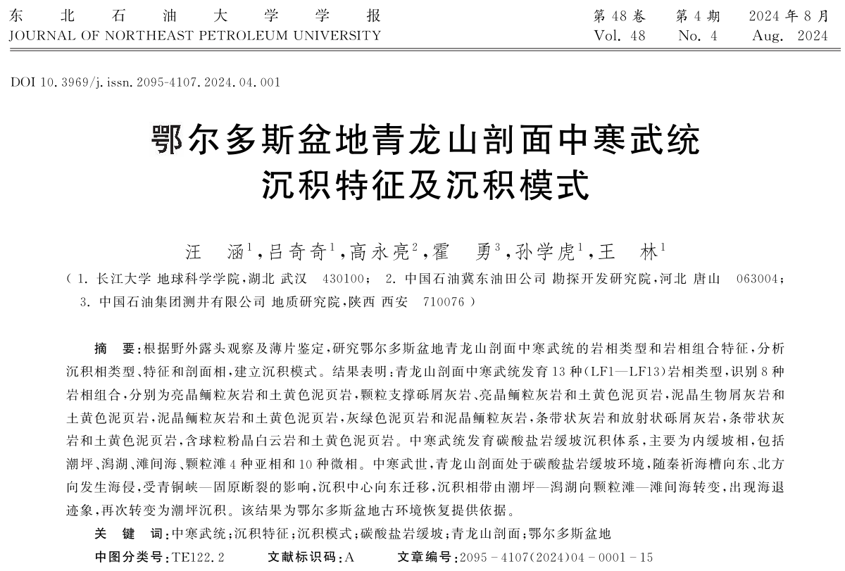 2024年8月15日,西瓜视频 22级硕士研究生汪涵在《东北石油大学学报》上发表题为“鄂尔多斯盆地青龙山剖面中寒武统沉积特征及沉积模式”的研究论文,西瓜视频 为论文第一署名单位,硕士研究生汪涵为论文第一作者,其导师吕奇奇副教授为该文通讯作者。