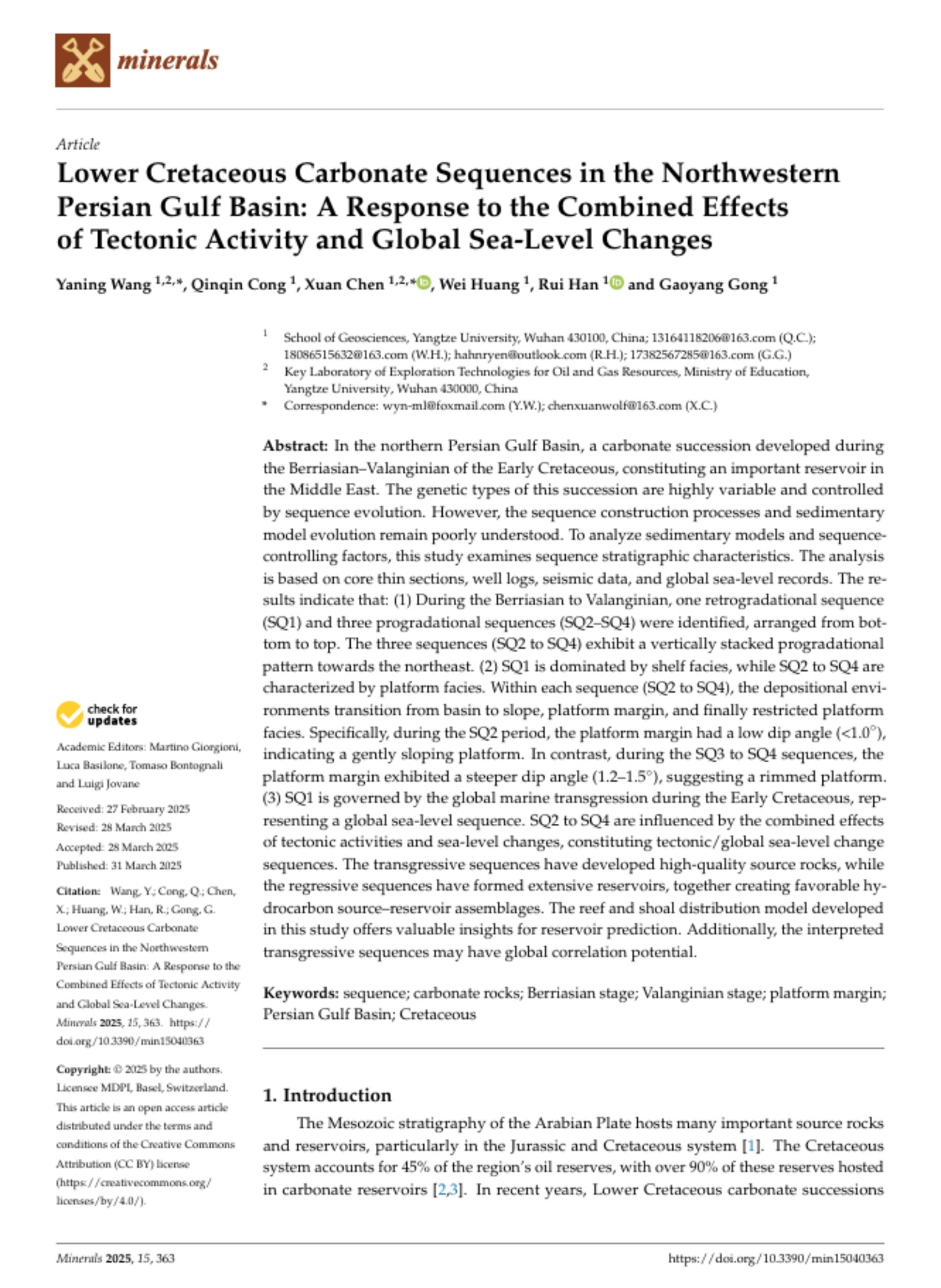 西瓜视频 王雅宁副教授在《Minerals》上发表题为“Lower Cretaceous Carbonate Sequences in the Northwestern Persian Gulf Basin: A Response to the Combined Effects of Tectonic Activity and Global Sea-Level Changes”的研究论文。西瓜视频 为论文第一署名单位,王雅宁副教授为第一作者,研究生从琴琴为第二作者。