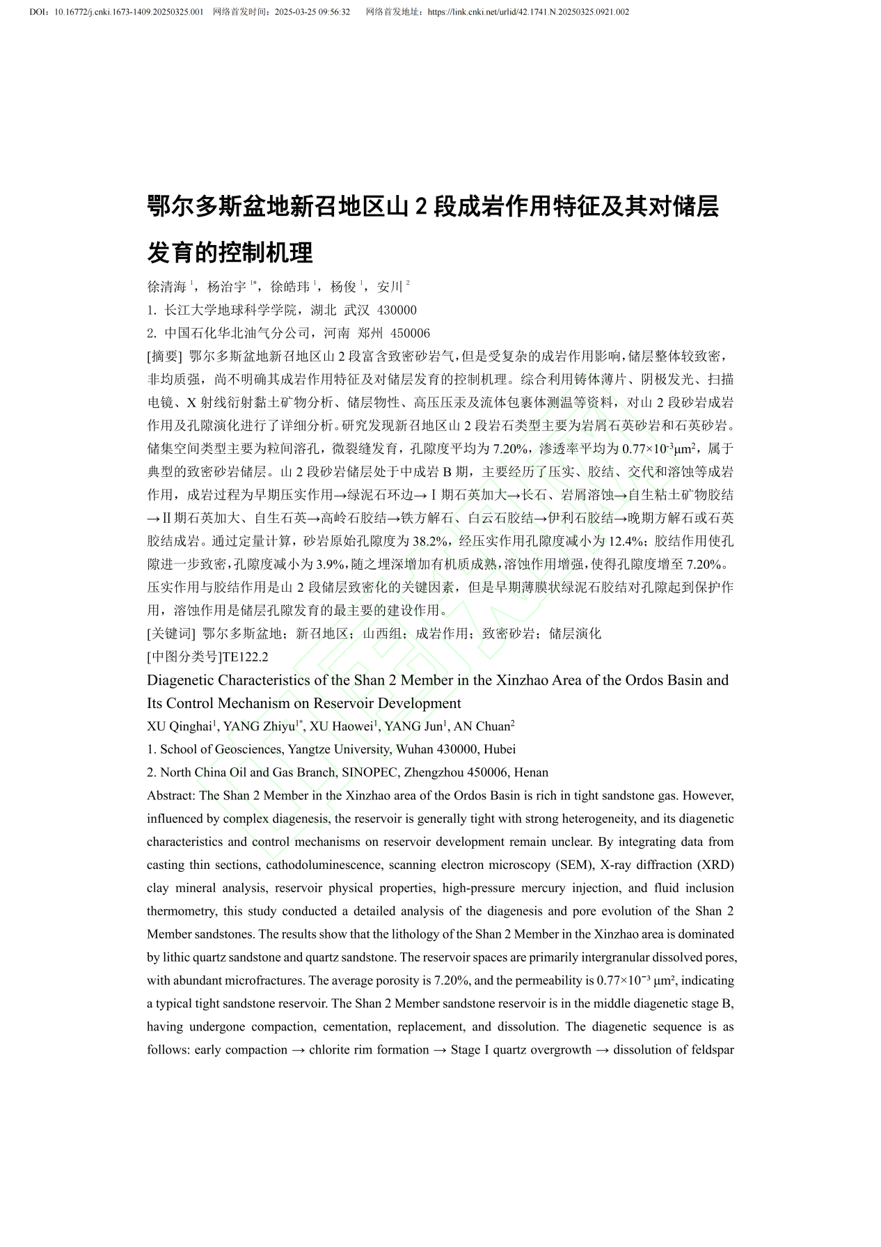 西瓜视频 硕士生杨治宇在《西瓜视频 学报》上发表题为“鄂尔多斯盆地新召地区山2段成岩作用特征及其对储层发育的控制机理”的研究论文,西瓜视频 为论文第一署名单位,徐清海副教授与杨治宇为共同第一作者。