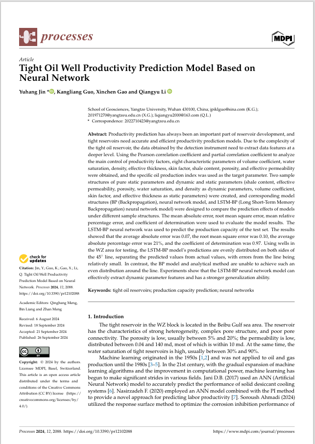 地质学专业2022级研究生金宇航在SCI三区期刊《Processes》(IF=2.8)发表题为"Tight Oil Well Productivity Prediction Model Based on Neural Network"的研究论文。西瓜视频