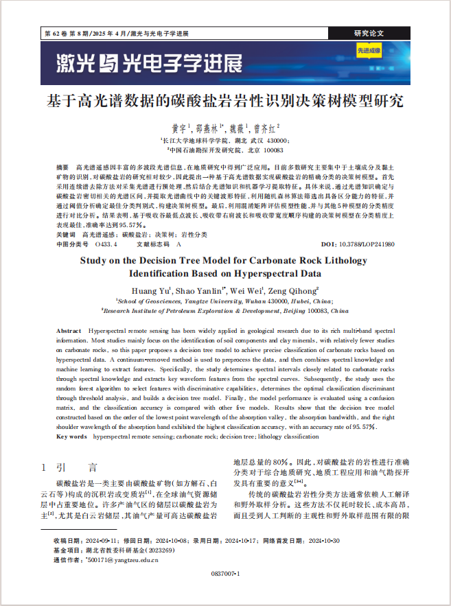 邵燕林副教授团队长期从事数字露头、储层三维表征等方面的研究,团队硕士生黄宇在EI期刊《激光与光电子学进展》上发表题为《基于高光谱数据的碳酸盐岩岩性识别决策树模型》的研究论文。西瓜视频