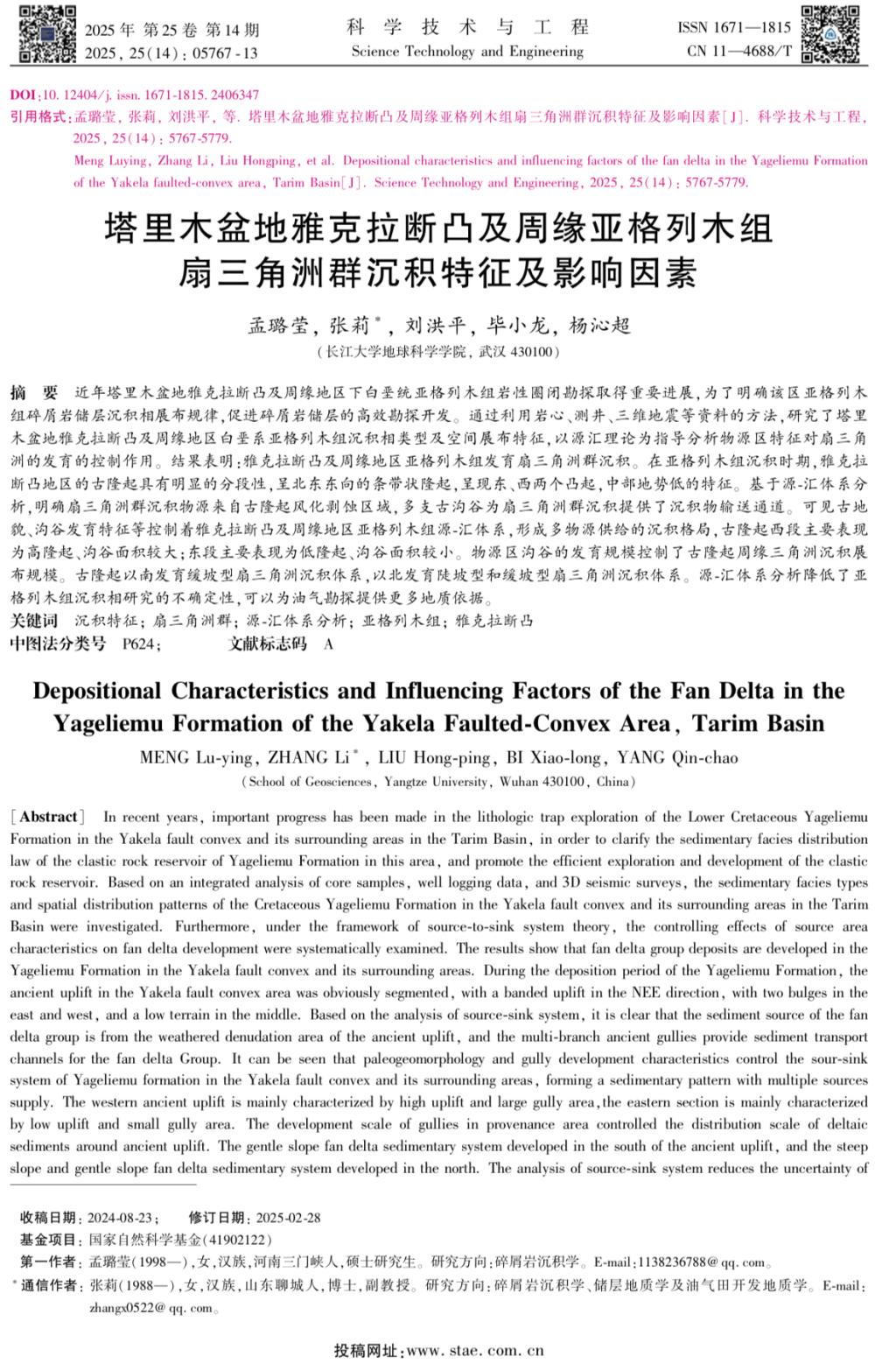 22级硕士研究生孟璐莹在期刊《科学技术与工程》上发表题为“塔里木盆地雅克拉断凸及周缘亚格列木组扇三角洲群沉积特征及影响因素”的研究论文。西瓜视频