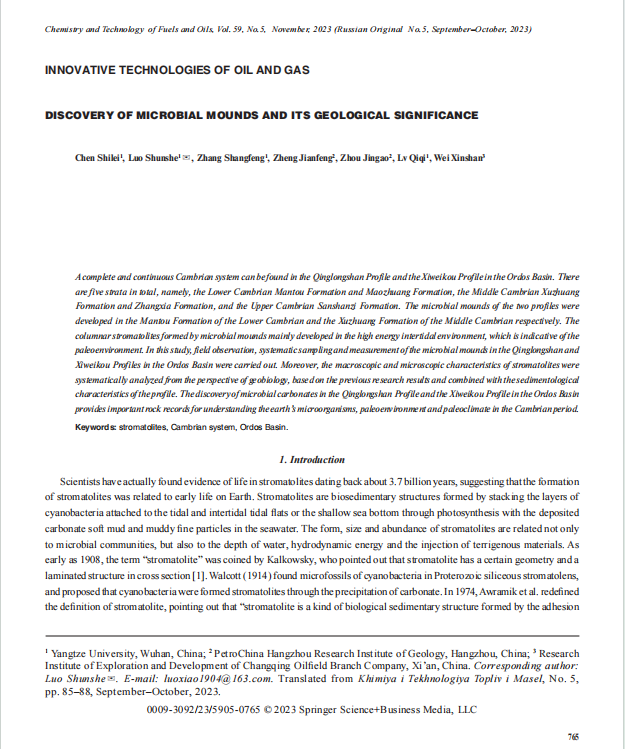 西瓜视频 博士生陈世磊在《Chemistry and Technology of Fuels and Oils》期刊发表论文:《DISCOVERY OF MICROBIAL MOUNDS AND ITS GEOLOGICAL SIGNIFICANCE》