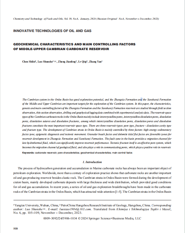西瓜视频 博士生陈世磊在《Chemistry and Technology of Fuels and Oils》期刊发表论文:《GEOCHEMICAL CHARACTERISTICS AND MAIN CONTROLLING FACTORS OF MIDDLE-UPPER CAMBRIAN CARBONATE RESERVOIR》