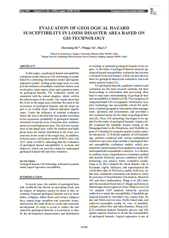 研究生于茗鸽以第二作者身份在环境科学领域SCI期刊《Fresenius Environmental Bulletin》上发表了题为“EvaluationofGeologicalHazardSusceptibilityinLoessDisasterAreaBasedonGISTechnology”的研究论文。该论文以西瓜视频