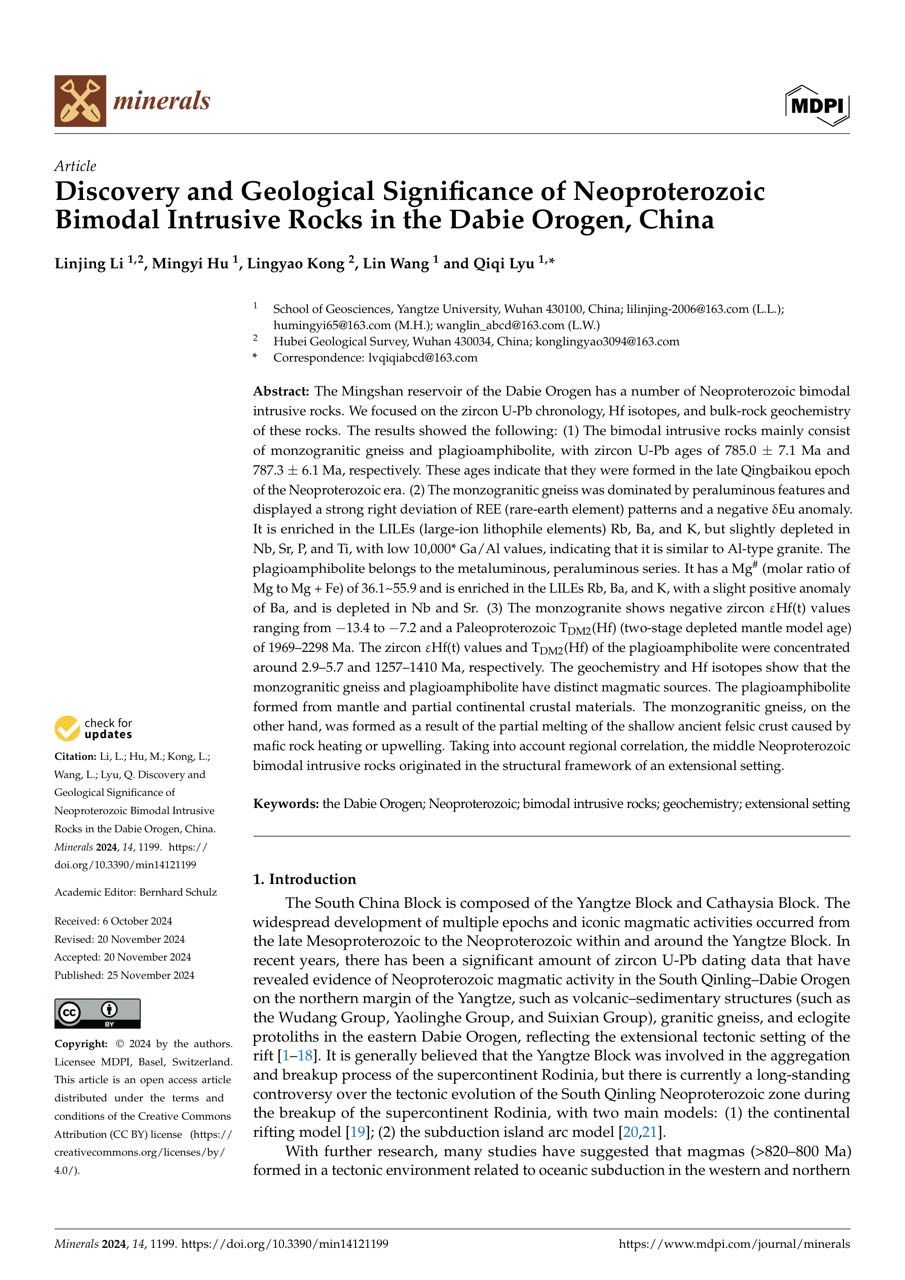 西瓜视频 博士生李琳静在《Minerals》发表论文揭示大别造山带新元古代双峰式侵入岩的地质意义