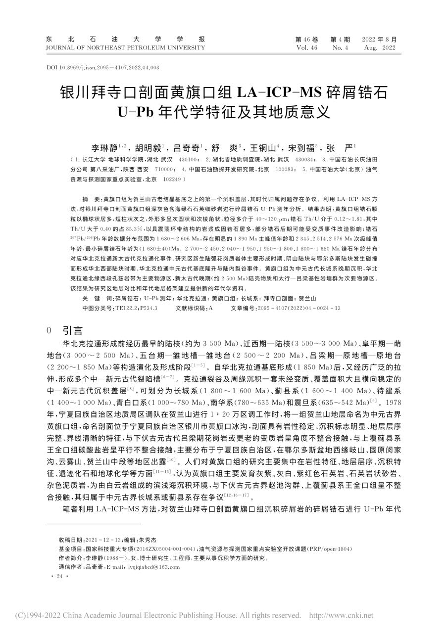 西瓜视频 博士生李琳静在《东北石油大学学报》发表论文揭示银川拜寺口剖面黄旗口组LA-ICP-MS碎屑锆石U-Pb年代学特征及其地质意义
